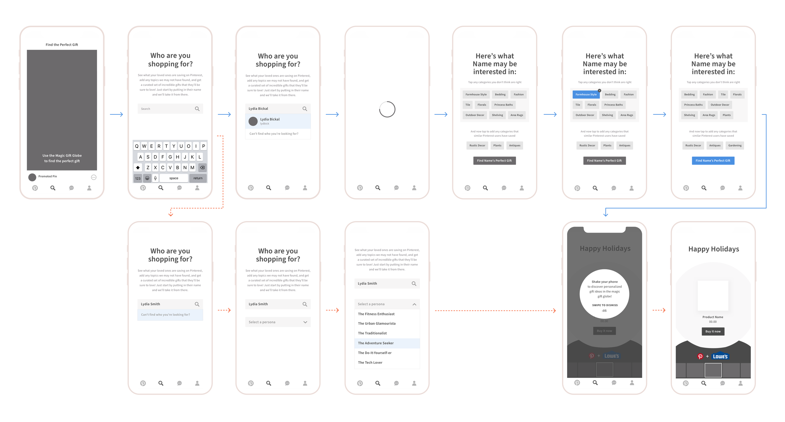 The final wireframes for the microsite took users through 3 potential pathways (after entering the experience from a sponsored holiday Pin). Users were prompted to search for the person they wished to shop for, edit personalized categories pulled from that person's pin activity, and then shop a list of recommended products within 1 of 3 co-branded gift globes. If users wished to shop for someone without a Pinterest account, they could shop via a persona instead (ie: The Adventure Seeker). And once users landed on their recommended gift globe, simply shaking their device caused the globe to "snow" and the products within it to refresh.